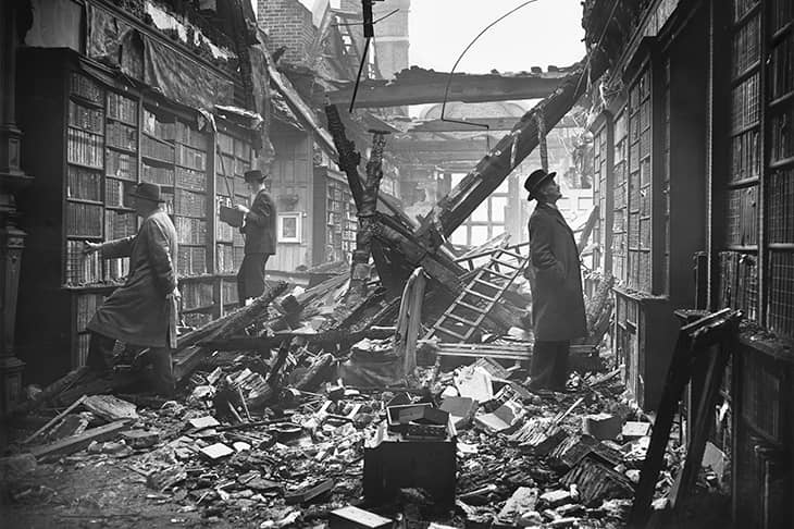 I cite the example of Mudie and the Victorian novel because it illustrates the key point that runs through this excellent history: that libraries are much more than passive repositories of knowledge. Rather, they have shaped both how we read and what we read, not to mention who gets to read. Another example: there is a well-known photograph, reproduced above, of the bombed-out library of Holland House in Kensington, hit during the Blitz, with readers in hats and macs still casually browsing the shelves. The image was circulated as propaganda: the stoicism of the home front, the persistence of culture. The library, and our relationship to it, can inspire national pride.