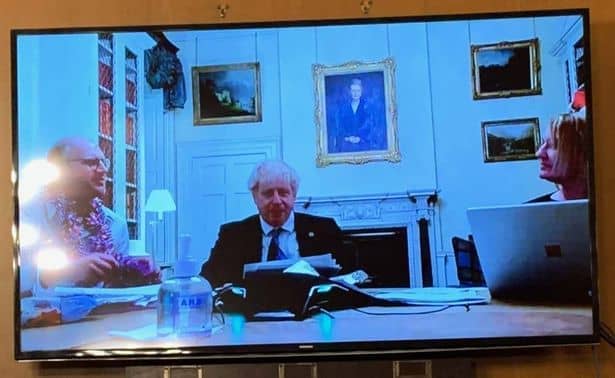 We see a typically dreary video-call snapshot. It shows a bored Prime Minister, flanked by two aides, all looking quite miserable. The only alcohol on display is in the sanitising hand-gel dispenser in the foreground.