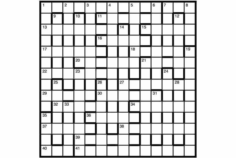A first prize of £30 for the first correct solution opened on 31 January. There are two runners-up prizes of £20. Please scan or photograph entries and email them (including the crossword number in the subject field) to crosswords@spectator.co.uk – the dictionary prize is not available. We will accept postal entries again at some point. Apologies that there may be a delay in sending out prizes at present.