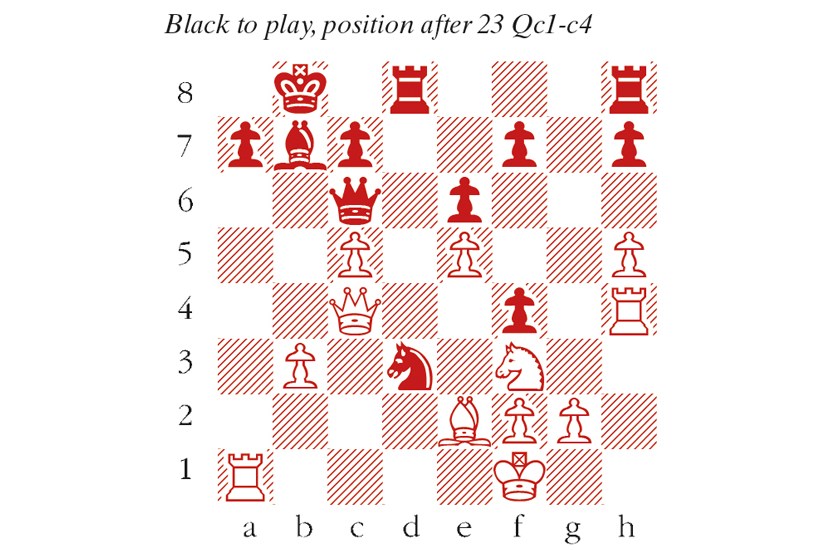 1 d4 Nf6 2 c4 e6 3 Nf3 d5 4 Nc3 dxc4 5 e4 b5 A fashionable variation. White’s next move recovers the pawn, but cedes an enduring outpost on d5. 6 e5 Nd5 7 Nxb5 Nb6 8 Be2 Be7 9 Be3 Nc6 10 h4 Bb7 11 h5 Qd7 12 Nc3 Nb4 13 Kf1 O-O-O 14 b3 cxb3 15 axb3 Kb8 16 Na4 N6d5 17 Bd2 g5 A strong advance, as any capture of the pawn opens up a useful file for the Black rooks. 18 Nc5 Bxc5 19 dxc5 Qc6 Setting up the the queen and bishop battery is tempting, but White’s next move threatens Qc1-c4, to embarrass the Nb4. Better was 19…g4 20 Nd4 Nc6! and Black is doing well in the complications after 21 Bb5 Ndb4! 20 Qc1 Nf4 21 Bxf4 If 22 Bxb4 Nxe2 23 Kxe2 Qe4+ recovers the piece. gxf4 22 Rh4 Nd3 23 Qc4 (see diagram) Nxe5 24 Nxe5 Qxg2+ 25 Ke1 Qg1+ 26 Bf1 Rd5 27 Nf3 Qg7 28 Rc1 Rhd8 29 c6 Qb2 30 cxb7 Hard to resist, since it also threatens mate with Qxc7. But the correct way to extinguish the attack was 30 Be2! Ba6 31 Qc2 Now Black forces a draw. Re5+ A clever check, because 31 Nxe5 Qd2 is mate. 31 Be2 Rxe2+ 32 Kf1 Rxf2+ 33 Kg1 Qg7+ This wonderful switchback ditches the rook to save the game. Instead, 33…Rg2+ 34 Kh1 sees Black run out of checks. 34 Kxf2 Qg3+ 35 Ke2 35 Kf1 drops the knight with check. Qg2+ 36 Ke1 Qg3+ Draw agreed