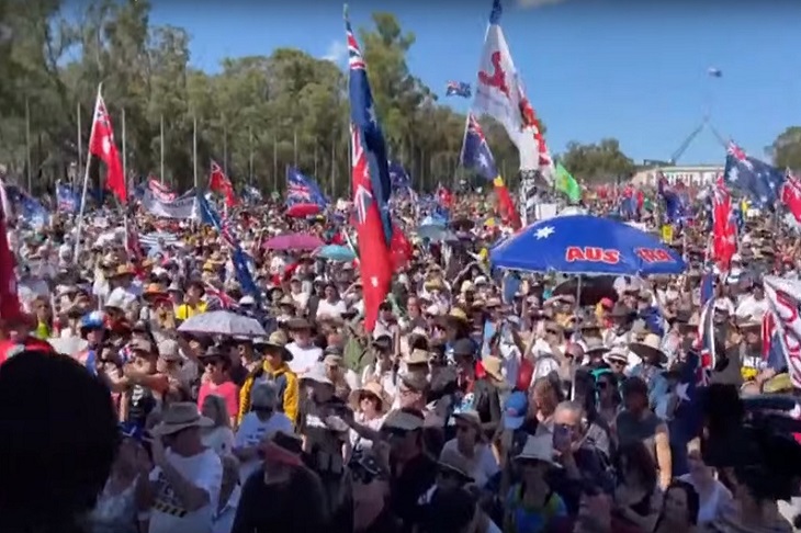 ‘No more mandates!’ read one sign. ‘End tyranny. Free Australia!’ said another. ‘Freedom convoy to Canberra. Since 2020 I’ve lost my business.’