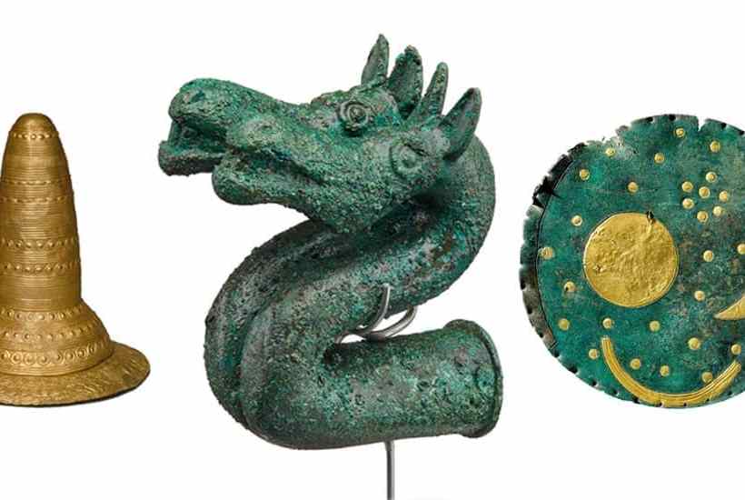 This sunholder, Danish from about 1200 BC, is of great beauty and, like many of the artefacts on show, has a reticence of artistry that comes not from primitive crudity but from the choices of an accomplished craftsman. None is more exactly judged than the Shropshire sun pendant, found in 2018 by a detectorist, perfectly shaped like a golden Art Deco tangerine segment, strictly incised with parallel semicircular grooves and triangular patches hatched to reflect the sun’s beams. Dr Wilkin likens it to the craftsmanship of Fabergé, and it seems to me in better taste.