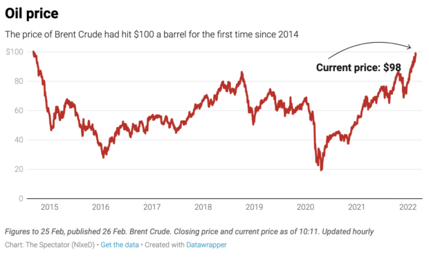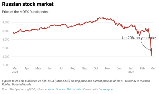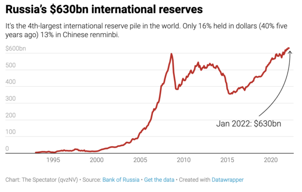 On The Spectator’s data hub we have a new Ukraine section featuring oil prices, stock markets, maps and more. It shows how Putin has been preparing for sanctions with international currency and gold reserves of $630 billion, the fourth-highest in the world – only 16pc is held in dollars, up from 40pc five years ago. This should help shore up the rouble, at least in the short term. Putin has also been building a domestic alternative to Swift, the international (and Belgian-based) bank transfer system: a great many Russians are using their homemade alternative, limiting the blow if Russia is kicked out of the existing system.