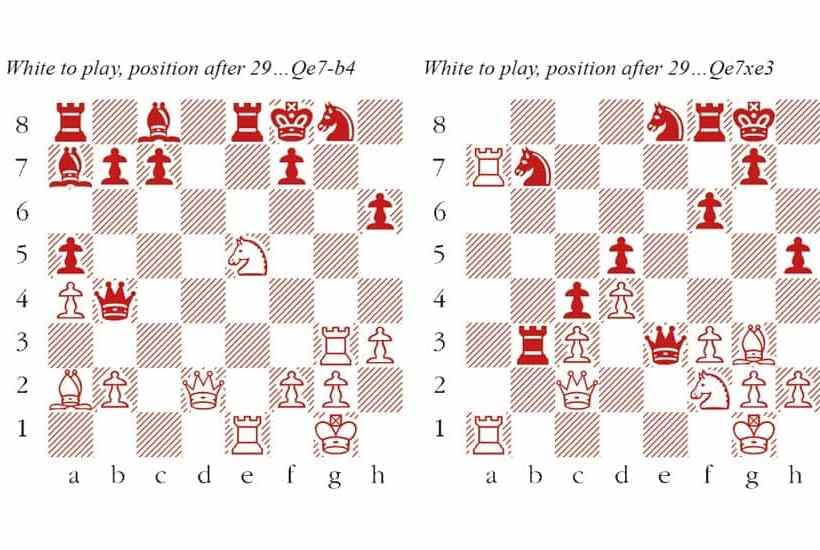 1 e4 e5 2 Nf3 Nc6 3 Bc4 Bc5 4 O-O Nf6 5 d3 O-O 6 Re1 h6 7 c3 d6 8 Nbd2 Bb6 9 h3 Ne7 10 d4 Nc6 11 a4 a5 12 Ra3 An imaginative way to maintain the central tension. The rook is well placed in case Black grabs a pawn on d4. Re8 13 Ba2 exd4 14 cxd4 Nxd4 15 Nxd4 Bxd4 16 Rd3 Ba7 17 e5 Qe7 18 Rg3 dxe5 19 Nc4 Kf8 20 Bxh6 gxh6 21 Qd2 Ng8 Stronger was 21…Ng4! since 22 hxg4 Qg5! puts a break on White’s attack. Instead 22 Rxg4 looks frightening but after 22…Qf6 (to defend h6) 23 Rg3 e4 (to prevent Rg3-f3) Black’s defences seem to hold up. 22 Nxe5 Qb4 (see diagram above left) A better try was 22…Qf6 23 Rf3 Bf5, though it looks terribly shaky. White can choose between 24 Qf4 and 24 Nd7+. But the move played allows a powerful shot. 23 Rf3! f5 24 Qxb4+ axb4 25 Ng6+ Kg7 26 Rxe8 Nf6 Recovering a knight, but White’s attack continues into the endgame. 27 Re7+ Kxg6 28 Rg3+ Kh5 29 Bc4 Bd4 30 Be2+ Kh4 31 Rg6 f4 32 Reg7 h5 33 Rxf6 Bg4 A clever try. Instead, 33…Bxf6 34 g3+ Kxh3 35 Bf1 is mate. 34 Rxg4+ hxg4 35 Rxf4 Kg5 36 Rxg4+ Kf6 37 Rxd4 Rxa4 38 b3 Black resigns
