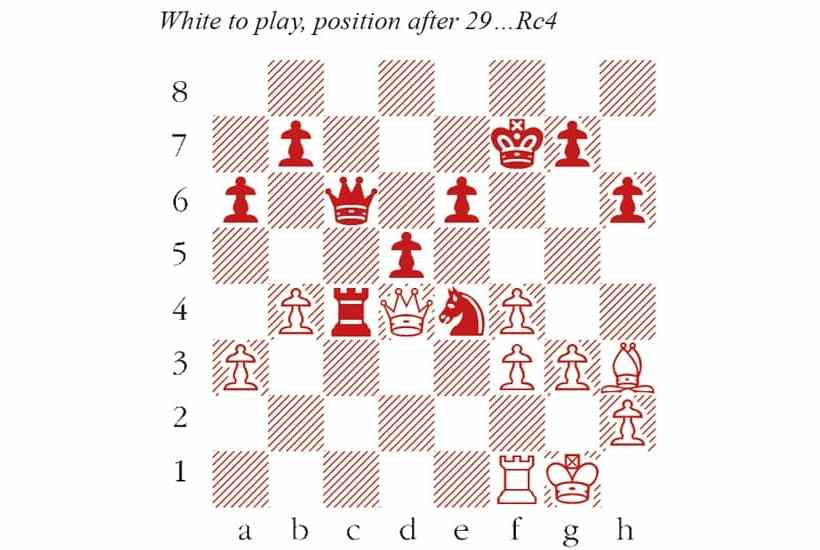 1 d4 d5 2 c4 e6 3 Nc3 a6 4 cxd5 exd5 5 a3 h6 6 Bf4 Nf6 7 e3 c5 8 Be5 Be6 9 Nge2 Nc6 10 Nf4 cxd4 11 Bxd4 Nxd4 12 Qxd4 Bd6 13 g3 Rc8 14 Rd1 Qa5 15 Rc1 O-O 16 Nxe6 fxe6 17 Bh3 Kf7 18 O-O Rc4 19 Qd3 Be5 20 Ne2 Rfc8 21 Rxc4 Rxc4 22 b4 Qa4 23 Nf4 Bxf4 24 exf4 Qc6 25 Qe3 Ne4 26 f3 Rc3 27 Qd4 Rc4 28 Qe3 Rc3 29 Qd4 Rc4 (see diagram) 30 Qe5 Nd2 Placing the queen on e3 was safer. Now if 31 Rf2 Rc1+ 32 Kg2 Nc4! Black gains a decisive advantage, e.g. 33 Qd4 Rd1! 34 Qa7 d4. 31 f5 Nxf1 This move is good enough for a draw, but requires an extraordinary follow-up. Another path to a draw was 31…Qb6+ 32 Kh1 Nxf1 33 fxe6+ but that also demands extreme precision from Black. For example, 33…Ke8? 34 Qh5+ Kd8 35 Qxd5+ wins. In fact, the only move which draws is 33…Kg8! when the imminent counterattack with Nf1xg3+ means that White has no time to advance the e-pawn. Instead White should bail out for a draw. One pretty line goes 34 Qb8+ Kh7 35 Bf5+ g6 36 Bxg6+ Kxg6 37 Qg8+ Kf6 38 Qf7+ Ke5 39 Qg7+! and here Black must acquiesce to the draw, since 39…Kxe6 40 Qxh6+ wins with a skewer, or 39…Kd6 40 Qd7+ forces the king back to e5. 32 fxe6+ Where should Black put the king? Unlike in the line above, 32…Kg8 is well met by 33 e7!, and then 33…Kf7 34 e8=Q+ Qxe8 35 Qxd5+ wins the rook, or 33…Qb6+ 34 Kxf1! is similar to the game. Andreikin’s next move looks like the only plausible alternative, but it turns out to be the decisive mistake. Ke8 In fact, the strongest move was extremely hard to foresee: 32…Ke7! allows White to capture with check, but after 33 Qxg7+ Kd6 there are several tries which all fall short. For example, 34 Qf8+ Kc7 35 e7 Qb6+ 36 Kxf1 Rc1+ 37 Ke2 Re1+ 38 Kxe1 Qe3+ and Black draws by perpetual check. 33 Qxg7 Qb6+ The advanced pawn affords White all manner of tactics. For example, 33…Qd6 34 Qf7+ Kd7 35 e7+! Qxe7 36 Qxd5+ wins. Or 33…Qc7 34 Qg6+ Ke7 35 Bxf1 Rc1 36 Qf7+ Kd6 37 e7! Qxe7 38 Qf4+ forks the rook again. 34 Kxf1 Rc1+ 35 Ke2 Re1+ The perpetual check is a mirage, but there was no better try. 36 Kxe1 Qe3+ 37 Kd1 Qd3+ 38 Kc1 Qe3+ 39 Kb1 Qd3+ 40 Kc1 Qe3+ 41 Kb2 Qd2+ 42 Ka1 Qc1+ 43 Ka2 Qc4+ 44 Kb2 Qe2+ 45 Ka1 White meets a check on e1 or d1 with Ka1-a2, when a subsequent check can be blocked by Qg7-b2. Andreikin falls on his sword: Qf1+ 46 Bxf1 Black resigns