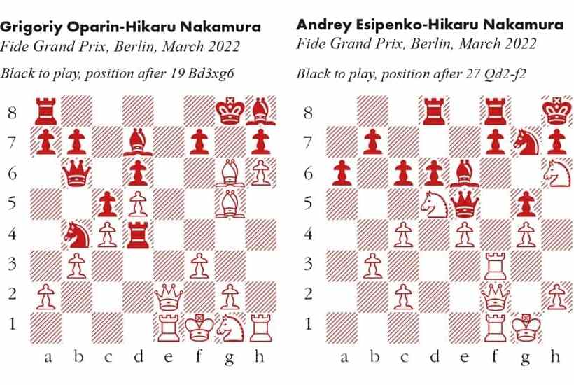 19… Nxd5! The knight is immune, due to Bd7-b5 with a pin. 20 Bxh7+ This lets most of the advantage slip, but the strongest move was far from obvious: 20 Bf5! Then 20…Bxf5 21 Qe8+ leads to mate, or 20…Nc3 21 Qe7 closes in. A sidestep with 20…Bc6, is the cue for 21 Bxh7+! Kxh7 22 Qc2+ Kg8 23 h7+ Kg7 24 Qf5 with Bh6+ to follow. Kxh7 21 Qc2+ f5 22 cxd5 Be5 Oparin retains the upper hand, but Nakamura is very much alive. 23 Ne2 Qa6 24 Kf2 Qd3 25 Qxd3 Rxd3 26 Rd1 Rxd1 27 Rxd1 a5 28 Rd3 a4 29 Re3 axb3 30 axb3 Ra2 31 Kg1 Ra1+ 32 Kf2 Ra2 33 Kg1 Draw agreed