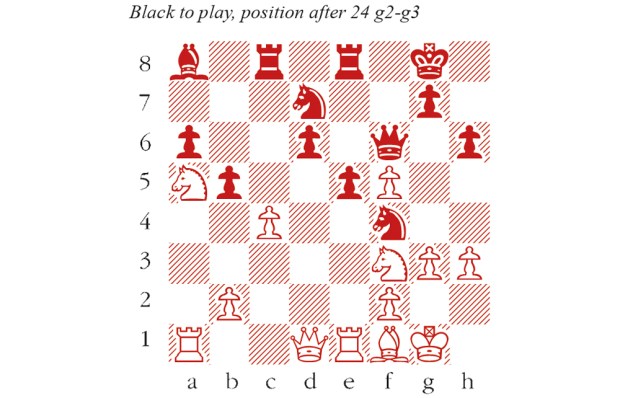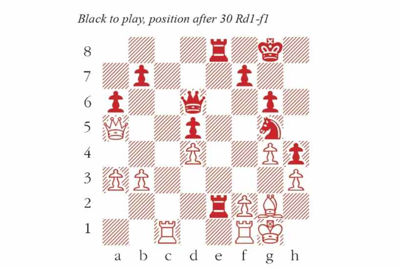 1 d4 Nf6 2 c4 e6 3 Nc3 Bb4 4 e3 O-O 5 Ne2 d5 6 a3 Be7 7 cxd5 exd5 8 Ng3 c5 9 dxc5 Bxc5 10 Bd3 Nc6 11 O-O Be6 12 Nce2 Bd6 13 Nd4 Nxd4 14 exd4 Re8 15 Nf5 Bxf5 16 Bxf5 Qb6 17 b3 g6 18 Bh3 Ne4 19 Qd3 Be7 A strong regrouping, seeking a more promising diagonal. 20 g3 Bf6 21 Be3 Re7 22 Rac1 Rae8 23 Rfd1 Qd6 24 Bg2 h5 25 Qb5 a6 26 Qa5 h4 27 g4 Bg5 28 Bxg5 Nxg5 29 h3 Re2 30 Rf1 (see diagram) 30…R8e3 A wonderful way to breach the kingside defences. 31 fxe3 31 Rc3 was more stubborn, but after 31…Rxc3 32 Qxc3 Ne6, preparing Ne6-f4, White remains in terrible trouble. Rxg2+ 32 Kxg2 Qg3+ 33 Kh1 Qxh3+ 34 Kg1 Qxe3+ 35 Kh1 Qh3+ 36 Kg1 Qg3+ 37 Kh1 Nf3 Moving in, and 38 Rc2 doesn’t help on account of Qh3+ 38 Qd8+ Kg7 39 Rxf3 Qxf3+ 40 Kh2 Qf4+ 41 Kg2 Qxg4+ White resigns Black will win the Rc1 with another queen check, emerging several pawns up.