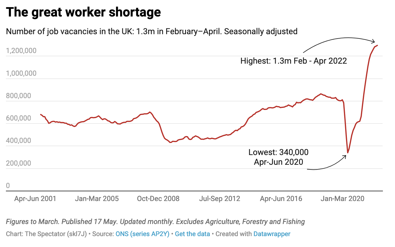 For the first time ever, the number of UK job vacancies – now almost 1.3 million – has overtaken the unemployment count. Normally, this would lead to people in work feeling much better off, and lead to pay hikes and bonuses as employers compete to recruit and retain employees. But in fact, regular pay in real terms (that is, after inflation and before bonuses) is down 1.2 per cent – fuelling the cost-of-living crisis that is now the central fact of British politics. What’s going on?