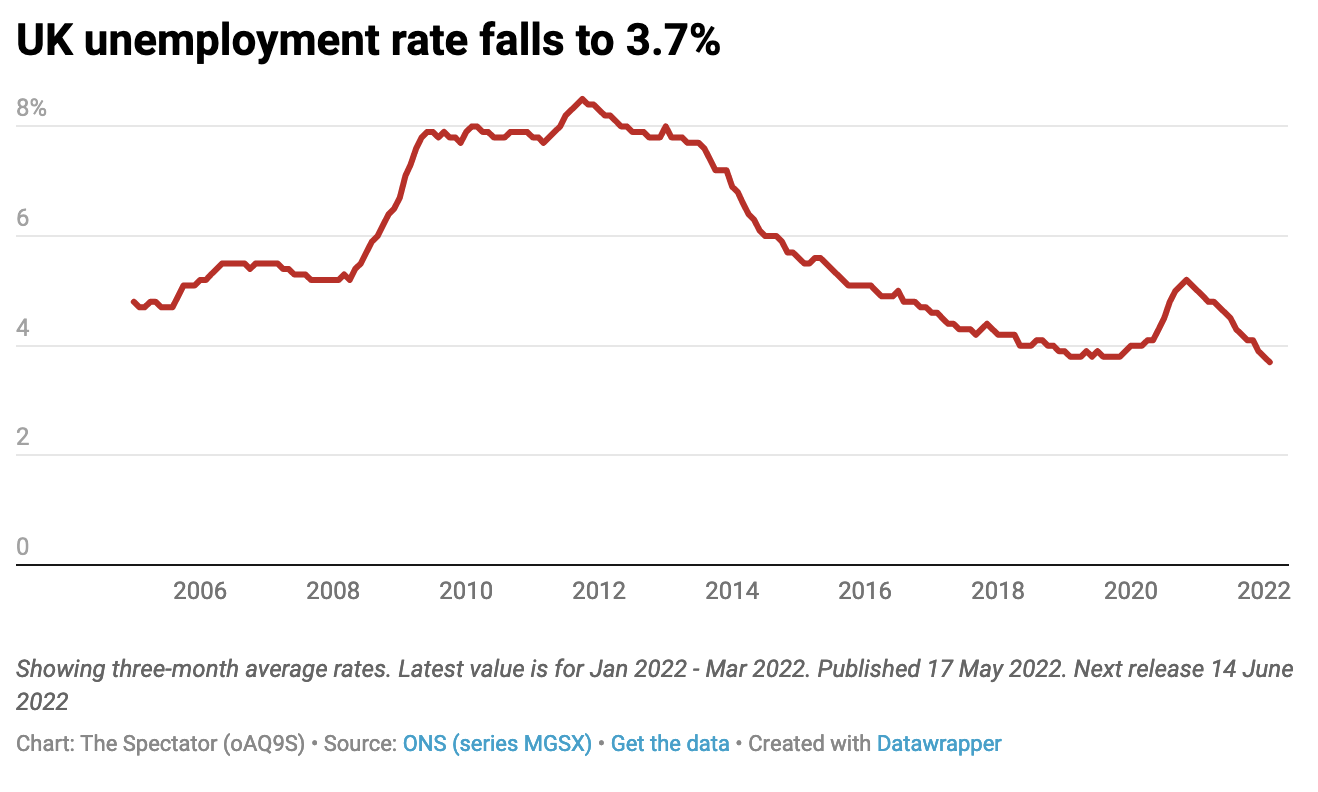 In short, today’s ONS labour market overview is yet another example of how inflation can ruin otherwise good news. Total salaries are up 7 per cent and unemployment fell to 3.7 per cent in Q1 (a record low not seen since the mid 1970s). This is yet another vindication of the furlough scheme, and marks another month in which the dreaded ‘stagflation’ has been kept at bay (rising unemployment is the final ingredient of ‘stagflation’, on top of lacklustre growth and high inflation – both of which the UK is already experiencing).