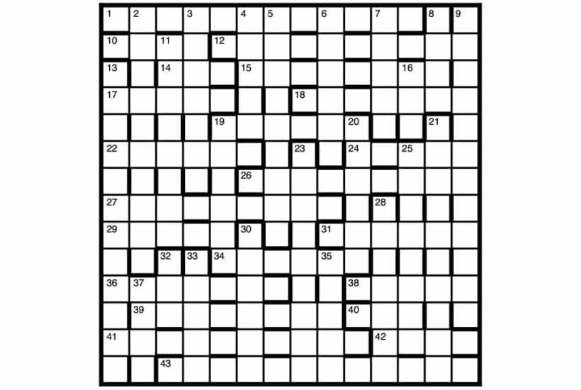 A first prize of £30 for the first correct solution opened on 1 August. There are two runners-up prizes of £20. Please scan or photograph entries and email them (including the crossword number in the subject field) to crosswords@spectator.co.uk – the dictionary prize is not available. We will accept postal entries again at some point.