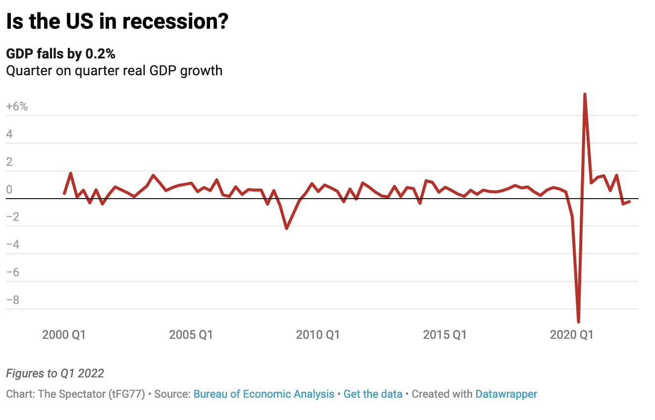 There’s an almighty debate ongoing in the US about what exactly a ‘recession’ is. Regardless of semantics, the numbers are bad. Figures released today show that the economy shrank by 0.2 per cent in the second quarter of this year, following a 1.6 per cent fall in the first quarter. Over the year, the US economy is now 0.9 per cent smaller than it was a year ago. Remarkably, the news comes just a day after the Federal Reserve raised interest rates by 0.75 per cent – the second such rise in as many months.