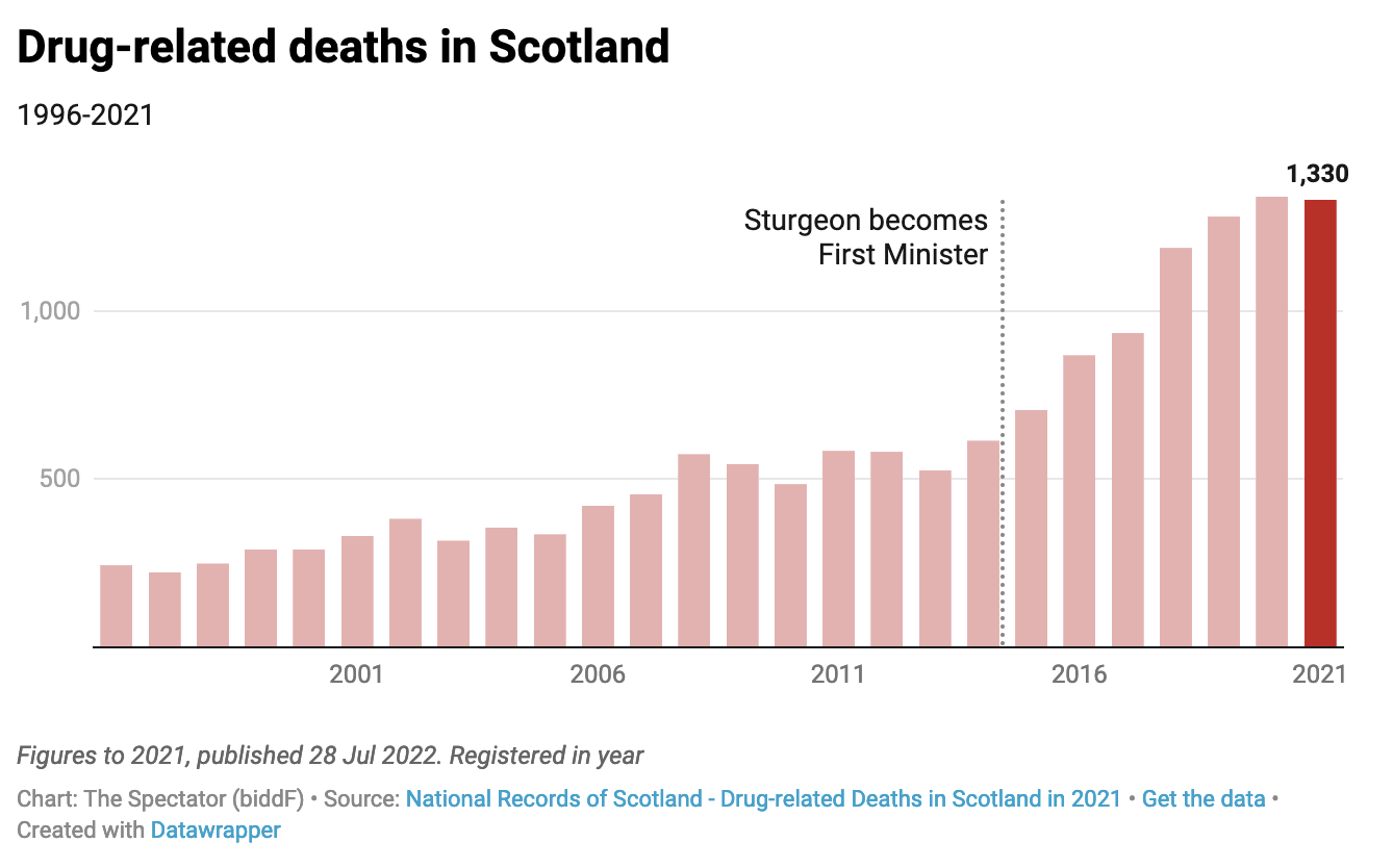 Last year, 1,330 people died as a result of drug misuse in Scotland, nine fewer than in 2020. It was the first time in seven years that the number of fatalities did not increase overall, but it also marked the second-highest annual death rate since records began. Deaths have increased among women, over 35s and residents of Glasgow, Tayside and Ayrshire. Scotland has significantly higher rates of drugs deaths by population than London, every region of England, Wales, Northern Ireland, the UK as a whole, and every country in Europe.