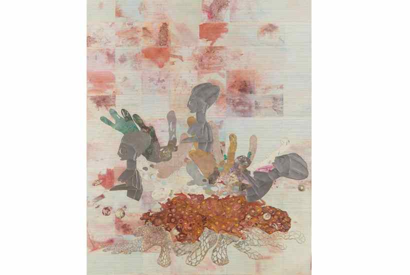 Ellen Gallagher’s room feels like an aquarium with windows on to magical underwater worlds. Her monumental watercolour series ‘Watery Ecstatic’ conjures a coral-coloured aquatic ecosphere aglow with mysterious marine life forms, the watercolour saved from wishy-washiness by the addition of crisp detail in precision-cut paper. Her 2019 series of large oils, ‘Ecstatic Draught of Fishes’, has a paler palette of greyed pinks and greens dispersed in clouds of scintillating bubbles. Taking Turner’s ‘Slave Ship’ as a starting point, it envisages the unborn babies of drowned pregnant slaves learning to breathe underwater and wandering the ocean floor as silvery wraiths evoking African Fang figures.