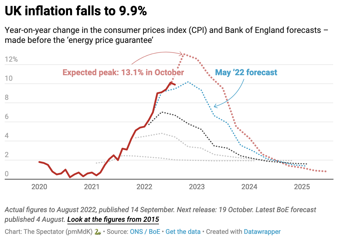 This morning’s surprise update from the Office for National Statistics shows headline inflation at 9.9 per cent on the year to August, down slightly from 10.1 per cent in July. While consumer inflation remains at a 40-year high, the drop from double digits back into single digits has the optimists whispering: might inflation have peaked?
