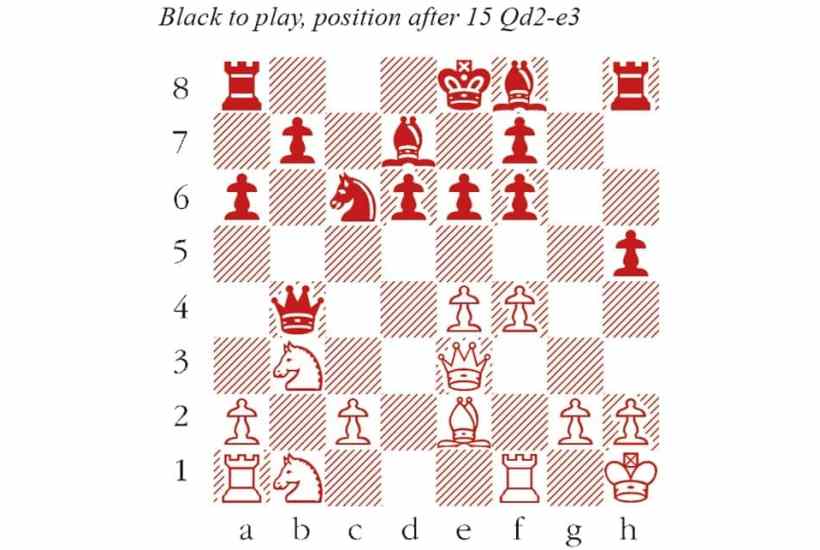 1 e4 c5 2 Nf3 d6 3 d4 cxd4 4 Nxd4 Nf6 5 Nc3 a6 6 Bg5 e6 7 f4 Qb6 8 Qd2 Qxb2 9 Nb3 Qa3 10 Bxf6 gxf6 11 Be2 h5 12 O-O Nc6 13 Kh1 Bd7 14 Nb1 A curiously challenging retreat, as the Black queen is in danger of being trapped. Nigel Short would later try 14 Nd1 (intending Nd1-e3-c4, with similar menace) against Garry Kasparov in their 1993 world championship match in London. Qb4 14…Qa4 15 a3 is a tricky move to meet. White threatens 16 Nb1-c3, so Black should move the knight away from c6. But not 15…Qxe4? 16 Bd3 Qd5 17 Nc3, trapping the queen in mid-board. Or 14…Qb2 15 a4 raises the spectre of Na3 or Nc3 followed by Rf1-b1. 15 Qe3 (see diagram) Covering b6, so that 16 a3 Qa4 17 Nc3 is threatened. d5 A dubious decision, but I suspect that Fischer was already feeling uncomfortable, and became seduced by the chance for a pretty counterthreat which arises at move 18. 15…Ne7 looks clumsy, but 16 a3 Qa4 17 Nc3 Qc6 18 Na5 Qc7 is fine for Black. 16 exd5 Ne7 17 c4 Nf5 18 Qd3 h4 This must be what Fischer was angling for when he played 15…d5. Now 19 Nc3 Ng3+! 20 hxg3 hxg3+ 21 Kg1 Bc5+ 22 Nd4 e5 is catastrophic for White. But Spassky’s next move prepares to plug the h-file (Bg4-h3) and leaves Fischer in a dreadful mess. 19 Bg4 Nd6 20 N1d2 Spassky leads in development, controls the centre and has a much safer king. The rest is easy for him. f5 21 a3 Qb6 22 c5 Qb5 23 Qc3 fxg4 24 a4 The queen is trapped, in view of 24…Qe2 25 Rae1. Less good is 24 Qxh8 Nf5, since queenside castling and Bf8-g7, offers Black counterplay. h3 25 axb5 hxg2+ 26 Kxg2 Rh3 27 Qf6 Nf5 28 c6 Bc8 29 dxe6 fxe6 30 Rfe1 Be7 31 Rxe6 Black resigns