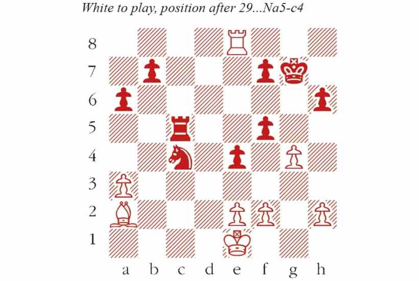 26 Rb8 f5 27 Re8 e4 28 g4 Rc5 29 Ba2 Nc4 (see diagram) 30 a4 Nd6 31 Re7 fxg4 32 Rd7 e3 33 fxe3 Ne4 34 Kf1 Rc1+ 35 Kg2 Rc2 36 Bxf7 Rxe2+ 37 Kg1 Re1+