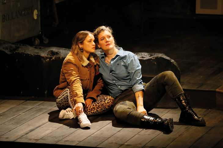 And never mind the rejig. As Peter Brook said once of Brecht’s rewrite of Coriolanus the original text is not burnt. This is in part a kind of play within a play Cyrano and it comes with a frisky, sportive mini-chorus given to frolics of song and dance. And it’s marvellous when Virginia Gay, who took Australian theatre by storm when she did a very un-Doris Day Calamity Jane, actually permits herself to break into song. Hark, the herald angel sings. But then the Virginia Gay/Sarah Goodes production turns everything on its head with a sort of lassooing sense of magic. You think for a stretch that you’re in the vicinity of poor theatre as if the plague had reduced everything to a gesture but then Goodes will string lights across the stage in a row and everything becomes circus-like and carnivalesque. There’s a log of a Christian (Yan in the production) Claude Jabbour who says he can’t be a Greek god, he’d have to be a Lebanese god, which somehow comes across as utterly wacky. Tuuli Narkle as Roxanne looks disconcerting and notably big in leopard skin tights until the penny drops that this cushiony appearance is ministering to a girl-on-girl eroticism in very deliberate defiance of straight norms. And besides, this Roxanne is pretty, pert, and offended by the way Cyrano assumes her lack of interest. There is a sharper note of erotic anger and of waves of love than we see very often in the depiction of lesbian wooing and the way in which Gay and Goodes use the mutation of this very classic romantic paradigm as their platform for this revelatory metamorphosis is both charged with danger and – in its rather shiver-inducing way – very satisfying.