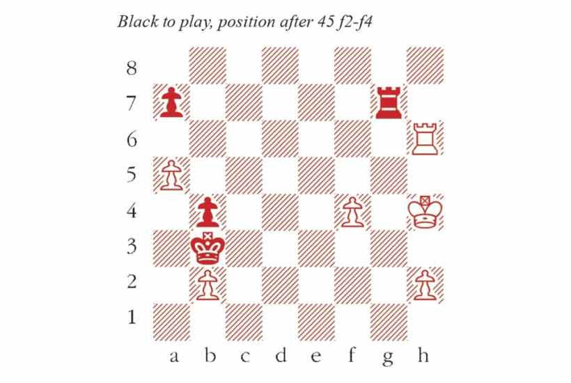 45… Kxb2 46 f5 b3 47 f6 Rg2 48 h3 The decisive error. 48 Rh5! adequately meets the threat of Rxh2+, while preparing to swing the rook over. 48…Rf2 49 Kg5 Ka2 50 Rh7 b2 51 Rb7 Rxh2 52 f7 Rf2 53 Kg6 ultimately leads to a draw. Ka2 49 Rh7 b2 50 Rb7 Rg6 An important move, separating the pawn from the white king before attacking it. 51 f7 Rf6 52 Kg5 Rxf7 53 Rxf7 b1=Q Now, 54 Rxa7 loses to a check on g1. The rest is straightforward. 54 h4 Qg1+ 55 Kh5 Kb3 56 a6 Kc4 57 Rg7 Qc5+ 58 Rg5 Qe7 59 Rf5 Kd4 60 Kg4 Qe6 61 Kg5 Ke4 62 Rf6 Qe7 63 Kg6 Ke5 64 Rf5+ Ke6 65 Rf4 Qe8+ 66 Kg5 Qg8+ 67 Kh5 Ke5 68 Rf1 Qd5 69 Rf8 Qd1+ 70 Kg5 Qd2+ 71 Kh5 Qd7 72 Rf1 Qb5 73 Rf8 Qxa6 74 Kg5 Qe6 75 Rf1 Qg8+ 76 Kh6 Qh8+ 77 Kg5 Qd8+ 78 Kh5 a5 White resigns