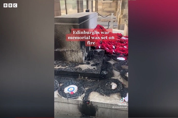 Anger is mounting after poppy wreaths made by veterans were set on fire at the Edinburgh war memorial, Scotland, in a disturbing act of vandalism.