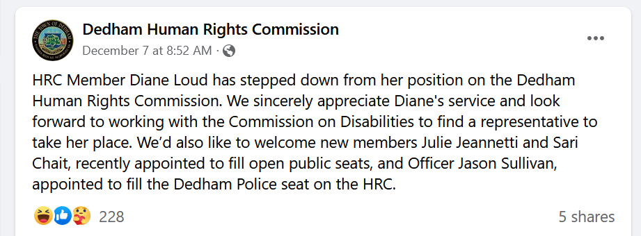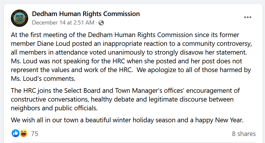 Diane Loud, also a member of the town’s Human Rights Commission, responded to Desmond’s post three days later, writing: