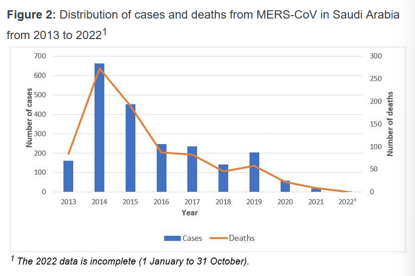 A sober look at the WHO’s Distribution of cases and deaths from MERS-CoV in Saudi Arabia from 2013-22 graph shows an enormous decline. If anything, MERS is practically dead.