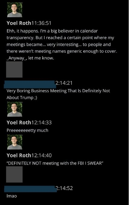 After January 6, there is evidence from internal Slack channels (Slack is an instant messaging program), of high-ups in Twitter getting a kick out of communications with federal agencies such as the FBI. One such conversation Taibbi provides shows head of Trust and Safety at the time, Yoel Roth, ‘lamenting a lack of “generic enough” calendar descriptions concealing his “very interesting” meeting partners’. The conversation goes as follows: