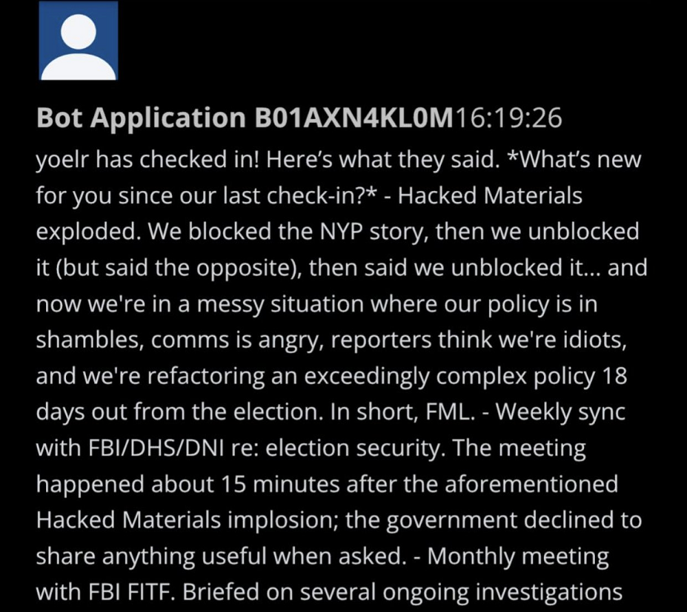 Twitter appears to have been, at one point, colluding with the FBI, DHS, and DNI to censor and suppress information pertaining to the 2020 election in a coordinated effort to unseat President Trump. It is, to say the least, not entirely ethical and may not be legal. Every single one of the individuals who took part in this to deliver the White House to the Biden administration and the Democrat Party should be investigated.