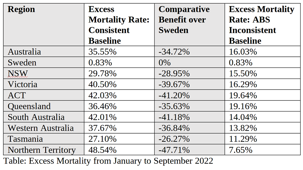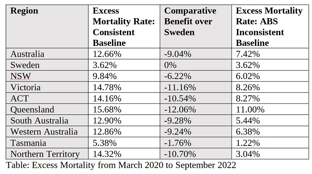 The following table is the excess pandemic mortality using the same baseline methodology. I have included the ABS figures for transparency purposes, although it is noticeable that even using a modified baseline the excess mortality of Sweden is substantially less than Australia.
