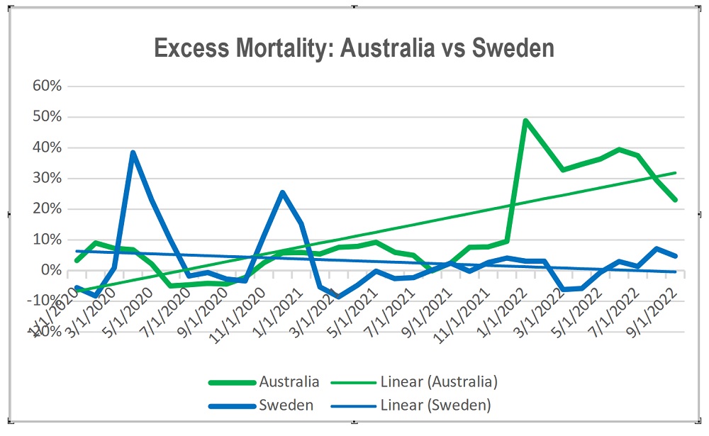The 2022 excess mortality figures are beginning to be a topic for discussion in the media as Australians realise the cost of the health policies implemented. The comparison with Sweden is stark. Once population increase is factored in, it may well be that in 2022 Sweden will have a lower mortality rate than prior to the pandemic. In comparison, Australia is experiencing very high mortality rates which may indicate that it will take some time to return to normal.