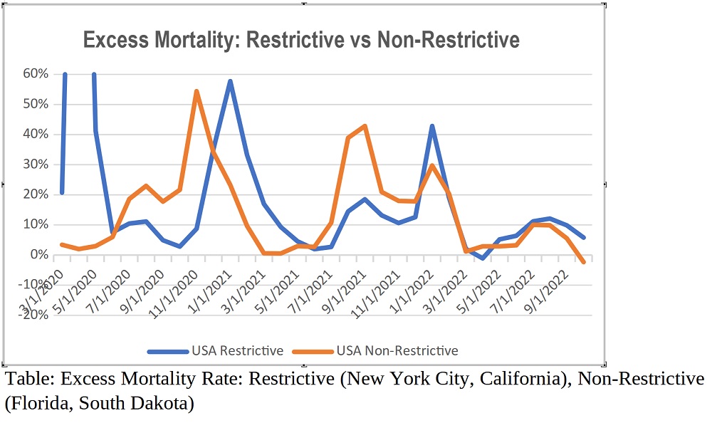 California and New York City were praised for some of the most restrictive health policies in the country. Florida was widely criticised for removing restrictions in 2020 and South Dakota had no restrictions. I have compared ‘restrictive’ versus ‘non-restrictive’ regions. Restrictive regions could be considered as having failed in their policies if there is not a significant benefit in excess mortality to offset the societal and financial hardships incurred.