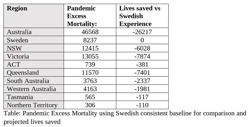 Given the enormity of the costs of health strategies over the past three years, the data revealed fails to justify even a moderate benefit in excess mortality, in comparison to less restrictive regions which were considered poor performers. Whilst not directly comparable to Australia, this point is emphasised with the select data from the USA. Restrictive health policies simply do not work and result in significant negative outcomes to the population. Why we chose the path we did and what we can learn should be the subject of an external review. This review should be conducted by someone from a region which provided a freer, more considered, cost/benefit approach to health and its impact on society. Anders Tegnell, Joseph Ladapo – we can offer you a tour of the Harbour city, endless beaches, the Great Barrier reef, Uluru, the Apple Isle, Barossa Valley, Horizontal Falls, and the Boxing Day Cricket Test, what could be more enticing?