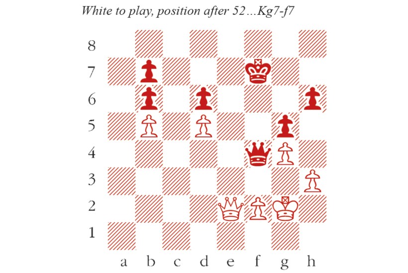 Nakamura’s last move was the blunder 52…Kg7-f7. Wesley So responded with 53 Qe6+ and in view of what came before, the response 53…Kg7 led to a draw by threefold repetition. Both players overlooked that 53 Qf3! was a winning move. White’s extra kingside pawn ensures a straightforward win after the exchange of queens. In case of 53…Kf6 54 Qxf4+ gxf4 55 h4 Ke5 56 Kf3 Kxd5 57 Kxf4 White wins easily. Black’s king will be diverted by an advancing g-pawn, while White mops up the queenside pawns.
