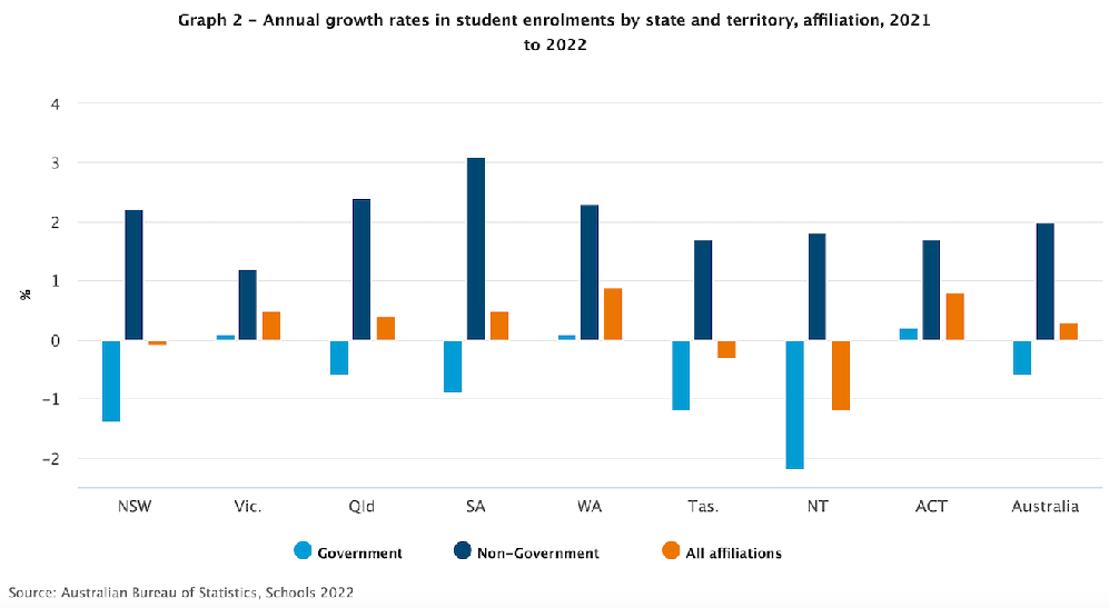 Significantly, this is a trend with is also occurring nationally with non-government schools in every state of Australia outperforming government ones. What’s more, in NSW, Queensland, South Australia, Tasmania and the Northern Territory, enrolments in government schools are in sharp decline. Note the following graph recently released by the Australian Bureau of Statistics: