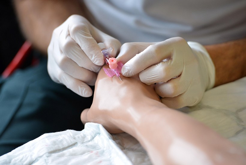 Now I could see he was losing his bottle. He was putting off the dread moment by wiping and wiping. Then he repeatedly double-tapped the vein with two fingers, something I’ve only ever seen done by heroin addicts in documentaries. I’ve had cannulas inserted in the crook of an arm and in the back of a hand many times. My veins are magnificent and proud. Nobody has ever had the slightest problem finding one and shoving in a hollow needle. Certainly nobody has ever had to tap one to make it stand out. Even money said he was going to muck this up.