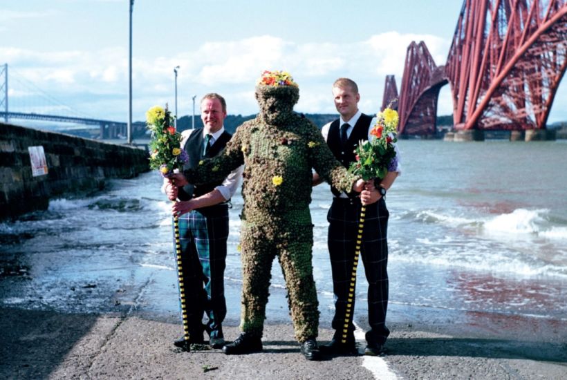 Among folk costumes, I find most impressive those that transform the human body into something unnameable. It is quite easily done. The Burry Man of South Queensferry, West Lothian, is annually covered with thousands of burdock burrs. His face is hidden. He cannot put his arms to his side or they’d be stuck as if by Velcro, so two attendants help him walk along for hours holding two tall sticks. To drink he must use a straw. Homer Sykes’s photograph of him accomplishing this in a pub in 1977 is now in the Government Art Collection.