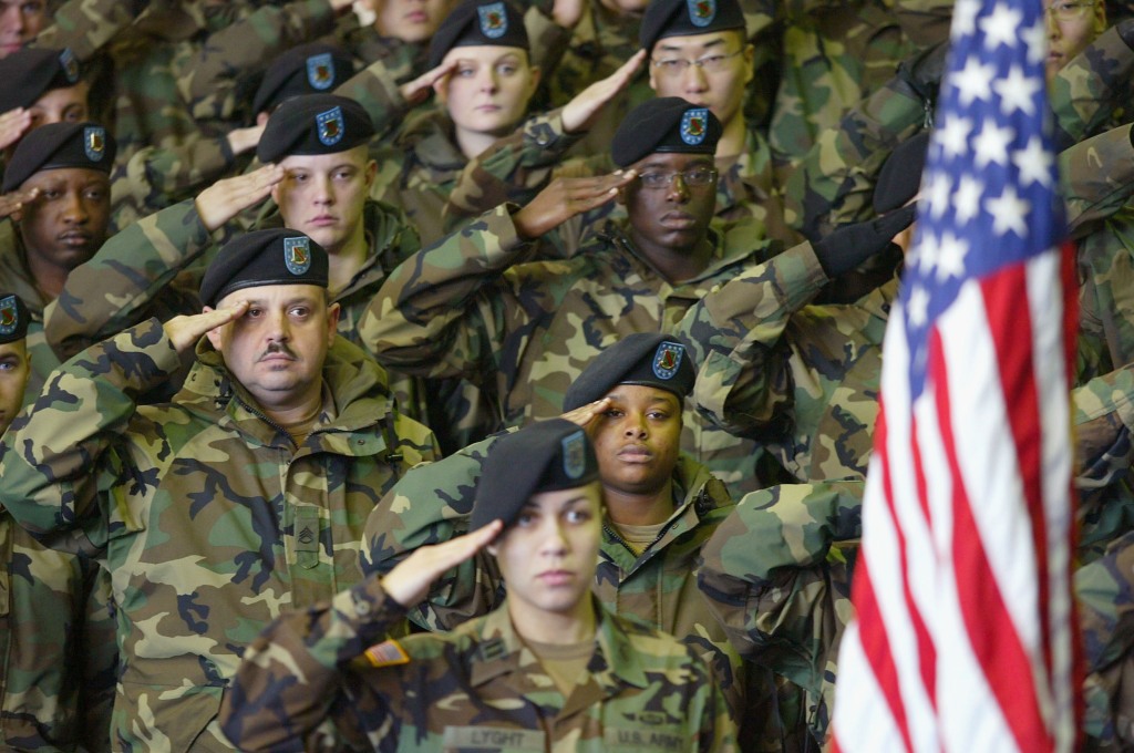 DAEGU, SOUTH KOREA – FEBRUARY 4: U.S. soldiers salute the flag of the USA during a welcome home ceremony for their colleagues who were part of a Task Force, deployed from South Korea to Iraq on October 2004, at U.S. Army Camp Walker on February 4, 2005 in Daegu, South Korea. Members from the Task Force participated in numerous operations at Camp Bucca, a detention facility, and successfully escorted of over 2,000 detainees from Baghdad to Camp Bucca. (Photo by Chung Sung-Jun/Getty Images)