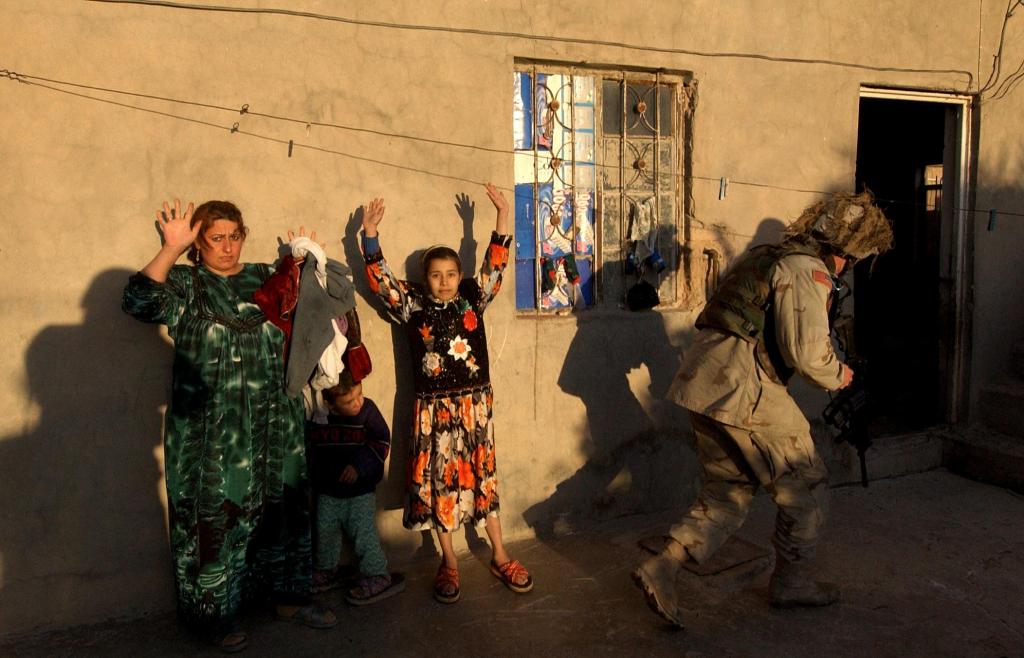 An Iraqi woman with her children raise their hands as US soldiers from the 4th Infantry division search their house in Tikrit, 180 Kilometers (110 miles) north of Baghdad, 19 December 2003. US soldiers captured Saddam hiding in a hole at a farm outside his hometown of Tikrit on December 13. AFP PHOTO/JEWEL SAMAD / AFP PHOTO / JEWEL SAMAD (Photo credit should read JEWEL SAMAD/AFP via Getty Images)
