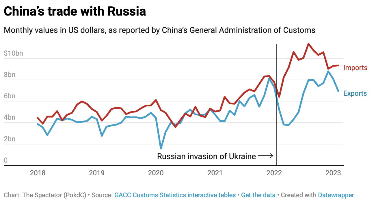 Beijing is already in effect bankrolling Putin’s war. China is by far Russia’s biggest trading partner, and trade between them surged by almost a third last year. There have been steep rises in Chinese imports of Russian oil, gas and agricultural products, helping make up for the falloff in sales to the west. A new gas pipeline is planned. And China has increased exports to Russia of dual-use items, including semi-conductors supplied through shell companies in Hong Kong and the Middle East.