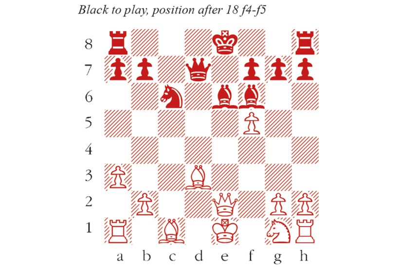 1 d4 Nf6 2 c4 e6 3 Nc3 Bb4 4 f3 Nc6 5 e4 e5 6 a3 Bd6 7 c5 Be7 8 dxe5 Nxe5 9 f4 Nc6 10 e5 Ng8 11 Ne4 d5 12 cxd6 cxd6 13 exd6 Nf6 14 Bd3 Bf5 15 Nxf6+ Bxf6 16 Qe2+ 16 Bxf5 Qa5+ Be6 17 d7+ 17 f5 Nd4! Qxd7 18 f5 (See diagram) Rd8? 19 Bb5! Qd5 The best try. The Be6 is lost, but Black gets some counterplay. 20 fxe6 Bh4+ 21Kf1 O-O 22 Bxc6 Qd1+ 23 Qxd1 Rxd1+ 24 Ke2 Re1+ 25 Kd2 Rd8+ 26 Bd7 Rxe6 Not 26…fxe6 27 g3! Rf1 28 Ke2 and the rook is evicted 27 Nf3 Rxd7+ 28 Kc2 Re2+ 29 Kb1 Be7 A sliver of hope remains. Draw agreed at move 85.