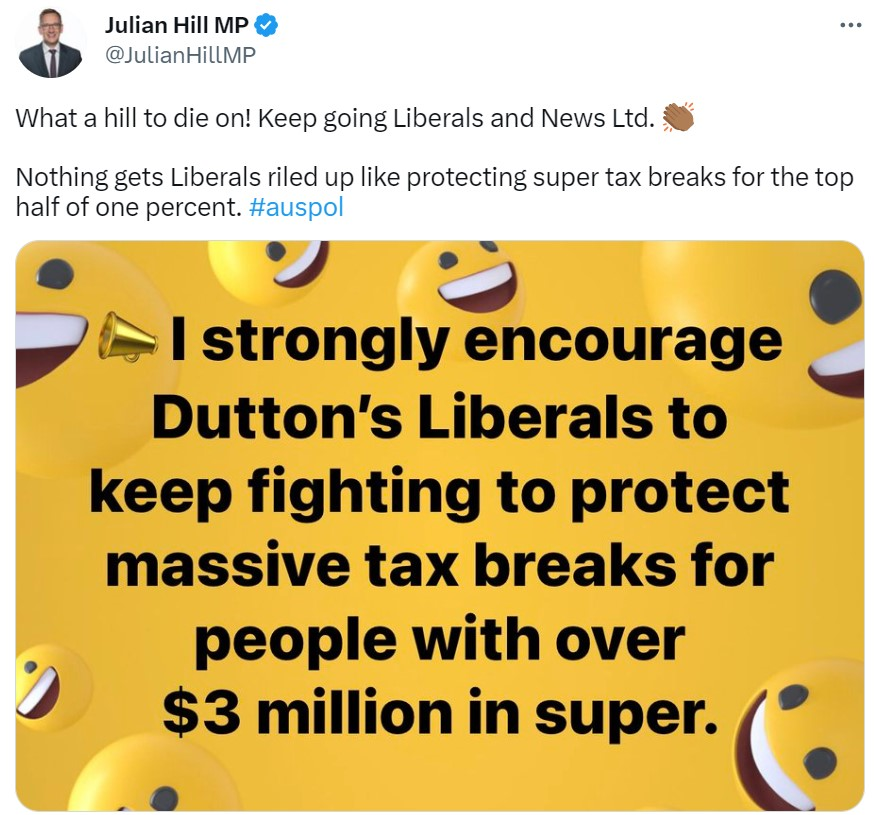 It’s no laughing matter Julian Hill MP, this is because the socialists deliberately did not index the $3 million level where the tax will kick in. So as inflation occurs, the $3 million will have a reducing present value.