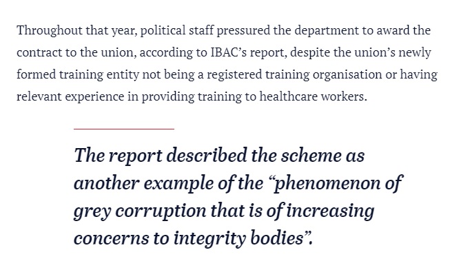 IBAC found that in 2018 the Premier’s Private Office and staff from the Health Minister’s office ‘breached their ethical obligations’ when they pressured the Department of Health and Human Services to award the union the training contract. IBAC said, ‘The union was given privileged access and favourable treatment,’ and that ‘…these failings and unethical conduct resulted in a contract that should not have been entered into.’