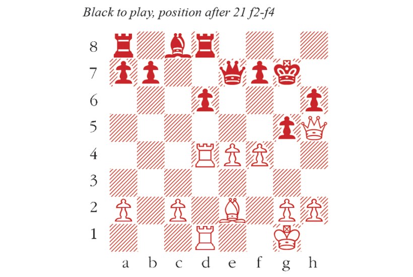 White’s f2-f4 push has increased the pressure, but the best response was to grab it: 21…gxf4 Then 22 e5! looks scary, but 22…Qg5 23 exd6 Be6 still offers reasonable hopes of survival.