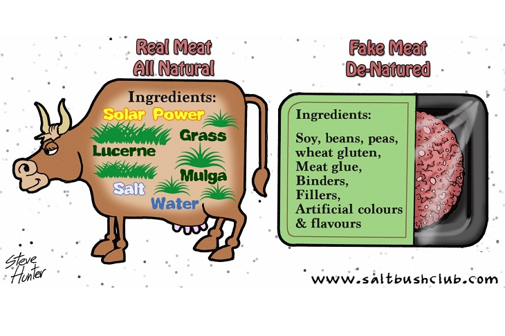 The world’s teeming cities are becoming increasingly reliant on grains, sugars, oil seeds, fruits, and vegetables grown by intense farming and heavily dependent on irrigation, herbicides, and chemical fertilisers. Grain-dependent feedlots produce much of our beef, pork, mutton, salmon, prawns, chickens, and eggs, and factories produce our baked, frozen and canned foods. Now greens are promoting denatured fake ‘meat’, and ‘milks’ containing no meat or milk.