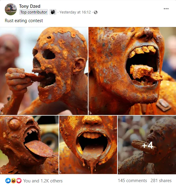 This is what bores me about AI. Its abundance; its bloated over-saturation; its complete lack of scarcity. Yes, it is entertaining – one hardly knows what example to point to for a good chuckle, and that’s the point! If you can imagine it, then someone’s done it, or if they haven’t then you could do it at the touch of a button. Yesterday this Midjourney render came up in my feed – ‘rust eating competition’ – and for whatever reason I burst out laughing. I was entertained.