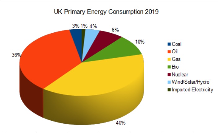 That is demonstrated by the overwhelming dominance of fossil fuels in the total energy use for Britain. (Electricity accounts for about a third of total energy consumption.)