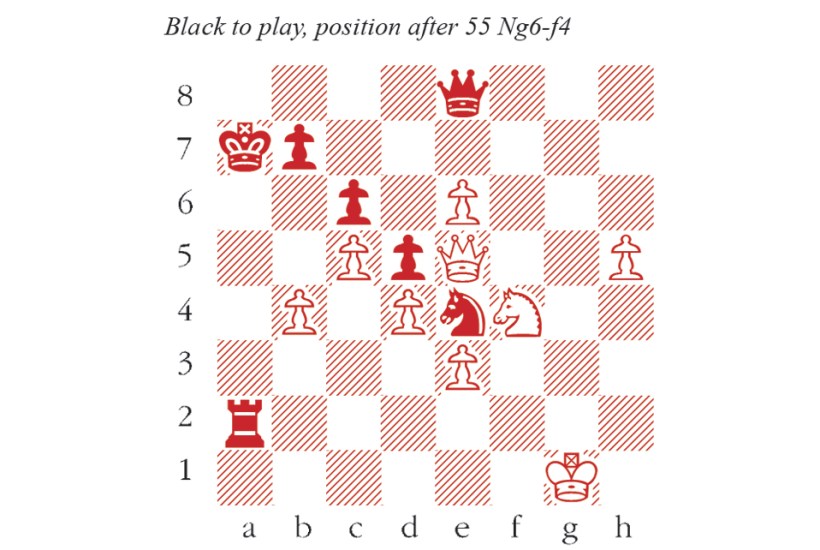 55… Ka6! 56 Qg7  A mistaken attempt to prevent what follows, which Arkell ignores, seeing that his king will be safe on c4. 56 h6 was a more challenging alternative. But after 56…Kb5 57 h7 (or 57 e7 Rb2! prepares Qe8-a8-a1) 57…Qa8 58 h8=Q Ra1+ 59 Kh2 Qa2+ 60 Ng2 Qb1 61 Kh3 Nf2+ 62 Kg3 (or 62 Kh2 Qg6!) 62…Qg6+! 63 Kxf2 Ra2+ and mate follows. Kb5 57 Qxb7+ Kc4  White’s queen is overworked, and cannot guard g8 and a8 simultaneously. 58 Qf7 Qa8 59 e7 Qa4 60 Ng2 Ra1+ 61 Kh2 Qd1 White resigns since 62 Kh3 Qh1+ 63 Kg4 Qxg2+ wins quickly.