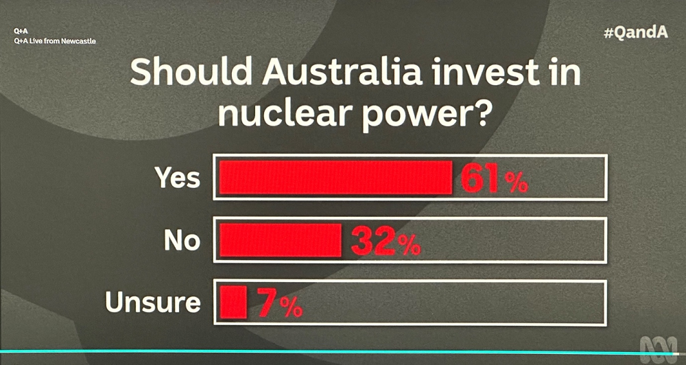 The problems with nuclear include the long gestation time required to bring a new plant online, a factor accentuated in Australia by long-standing political anxiety whipped up by the ALP and by anti-nuclear green parties. However, following a debate that encompassed nuclear on this week’s ABC program, Q and A, there was considerable support for nuclear shown by the (traditionally left-wing) online audience.