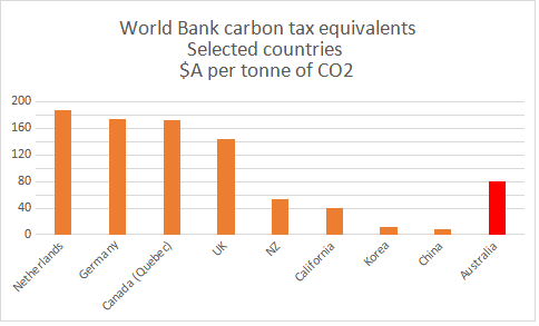 Deferring to government political sensitivities, Australia’s measures have not been included in the World Bank analyses of tax and ETS measures. A rationale for this is that our own schemes are based on ETS systems that address requirements to replace gigawatt hours of fossil fuel-derived electricity by wind and solar rather than emissions of carbon dioxide. However, the report notes Australia’s new Safeguard Mechanism is a pure rate-based ETS.