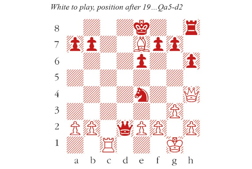 1 d4 Nf6 2 c4 e6 3 Nf3 d5 4 g3 dxc4 5 Bg2 c5 6 O-O Nc6 7 Qa4 Bd7 Being greedy with 7…cxd4 doesn’t work out well here: 8 Nxd4! Qxd4 9 Bxc6+ Bd7 10 Rd1! Bxc6 11 Qxc6+ bxc6 12 Rxd4 leaves Black with a blighted pawn structure. 8 Qxc4 cxd4 9 Nxd4 Rc8 10 Nc3 Nxd4 11 Qxd4 Bc5 12 Qh4 Bc6 Grandmasters of Duda’s calibre suffer calamities in the opening only very rarely. But it happened in a game in Dusseldorf earlier this year, where Wesley So played 13 Rd1, which Duda met with 13…Qb6. After 14 Bxc6+ Rxc6 15 Bh6! Black was in huge trouble, e.g. 15…O-O 16 Bxg7! Kxg7 17 Qg5+ is awful, while 15…Bxf2+ 16 Kg2 only exacerbates the problem. Duda tried 15…Bf8 but after 16 Rd3, his position was already beyond repair, since his king could not escape the centre. This trap has been known at least since the game Portisch-Radulov in 1978, claiming 20 victims, including several grandmasters. 13 Bxc6+ Rxc6 14 Rd1 Qa5 Duda is ready with his improvement on the game mentioned above. The purpose of placing the queen on a5 is that 15 Bh6 O-O 16 Bxg7 Bxf2+! works out fine for Black, as after 17 Kxf2 Kxg7 the g5 square is guarded so the position is equal. 15 Bg5 Be7 16 Rac1 h6 I suspect that Duda was trying to lure Carlsen into a trap here, but it backfires spectacularly. Better was 13…O-O, when 14 Ne4 Qe5 15 Nxf6+ Bxf6 16 Bxf6 gxf6 is about equal. 17 Ne4 Rxc1 17…Qe5 was the lesser evil, but 18 Rxc6 bxc6 19 Nxf6+ Bxf6 20 Bxf6 gxf6 21 Qb4 is grim to behold. 18 Rxc1 Nxe4 19 Bxe7 Qd2 (see diagram) Duda’s point is that White cannot win a rook: 20 Rc8+ Kd7 21 Rxh8 Qe1+ 22 Kg2 Qxf2+ 23 Kh3 Qf1+ 24 Kg4 Qf5 mate. 20 Bg5! Spectacular. The h6-pawn is pinned, while after a queen exchange on g5 White could collect the Rh8 with Rc8+. 20…Qxe2 21 Be3! Nd6 22 Qd4 also wins easily. All that remains is the move Duda tried: Nxg5 21 Rc8+ Ke7 22 Rxh8 Qxe2 23 Qb4+ Kf6 24 Qf4+ Kg6 25 Kg2 With a safer king, Duda would be in with a chance, but Carlsen soon creates decisive threats. e5 26 Qe3 Qxb2 27 h4 Ne6 28 Qe4+ Kf6 29 Re8 Qb5 30 Rb8 Nc5 31 Qd5 a6 32 Rf8 Black resigns