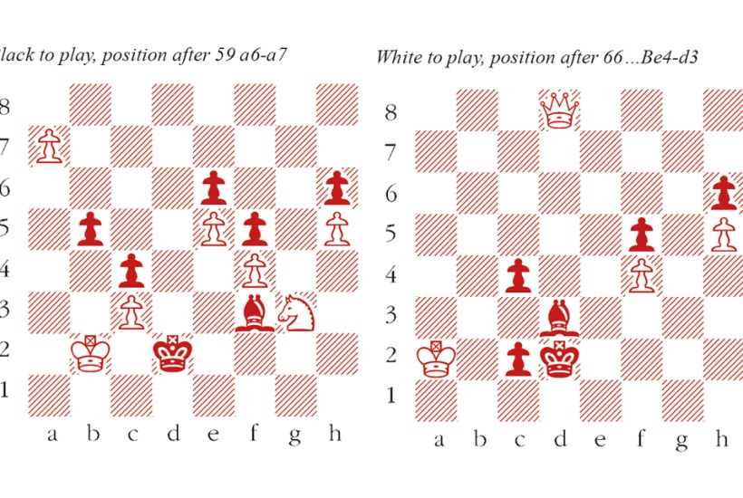 In the first diagram below, 59…b4 looks promising, but 60 Nf1+! wobbles the Black king off its ideal spot, and 60…Kd3 61 cxb4 c3+ 62 Kc1! is a dead end. Carlsen plays a tricky waiting move, eyeing up a role for the bishop in the complications which follow.